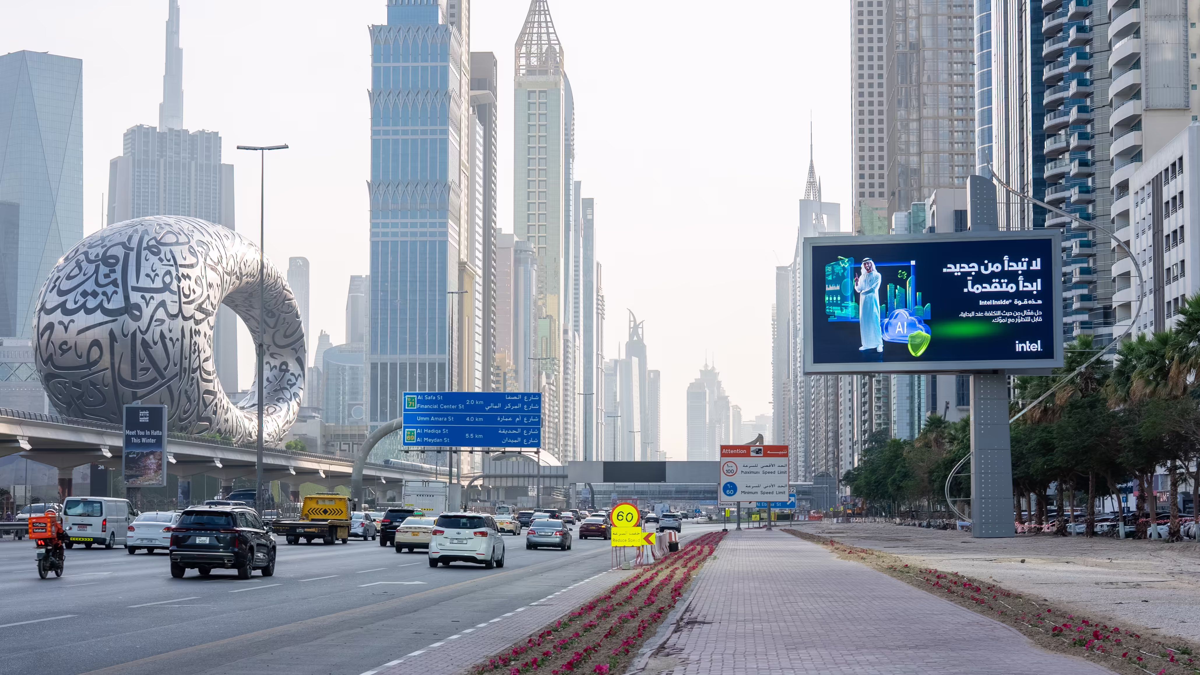 Text should only consist of few words with a minimum height of 80cm to insure a clearly visible message, with 50% Arabic and 50% English “ Arabic text to be on top in the layout”.